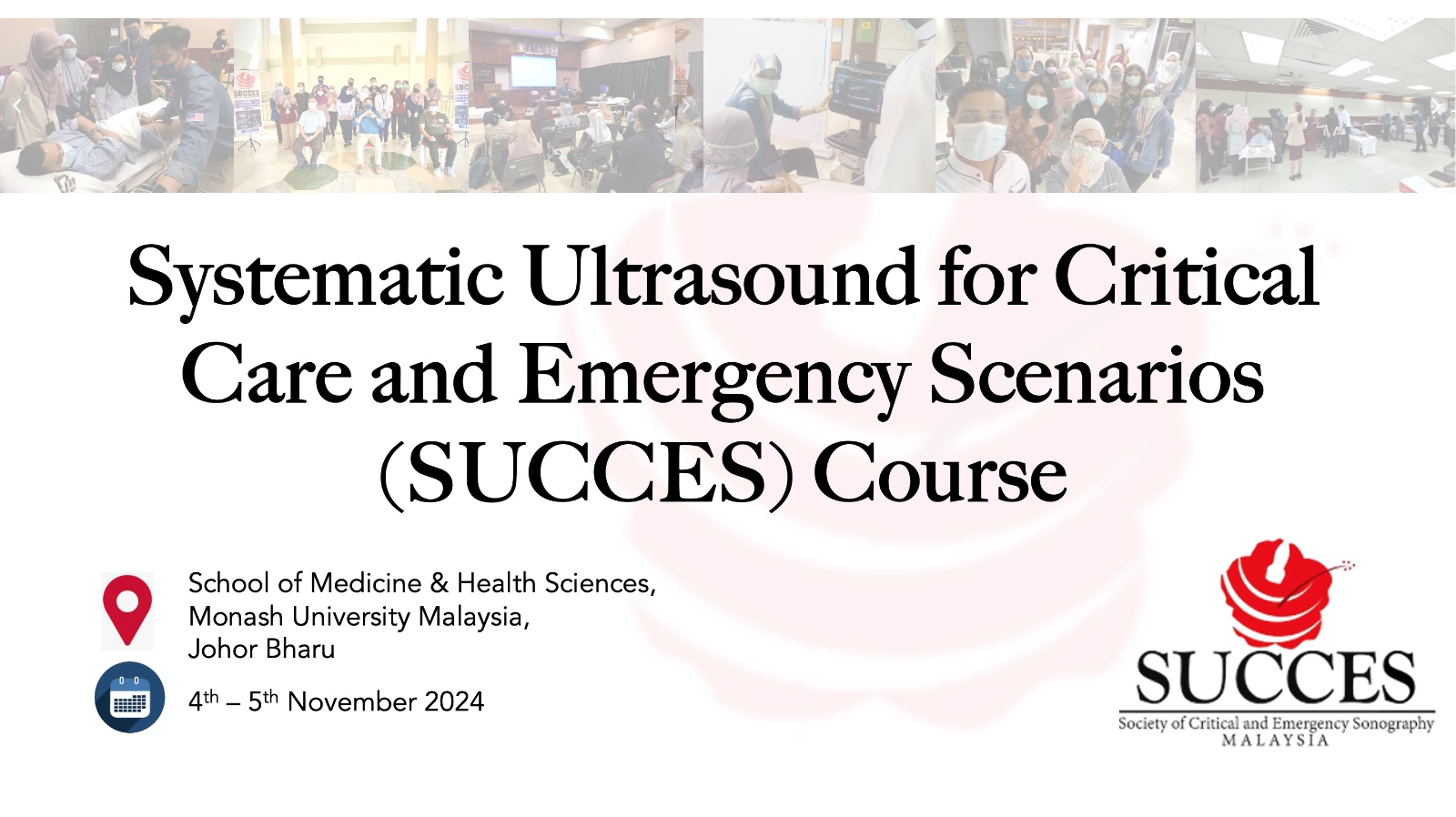SUCCES is a basic ultrasound course that aims to provide the skills required to perform and interpret targeted ultrasonographic examination based on clinical settings. The ultrasonographic examination may be multi-system, acts as extension of the clinical examination of a critically ill patient, and crucial for making rapid accurate clinical decision. The course consists of a two-day program which provides teaching on live models in small groups, giving ample opportunity to participant for more hands-on experience.